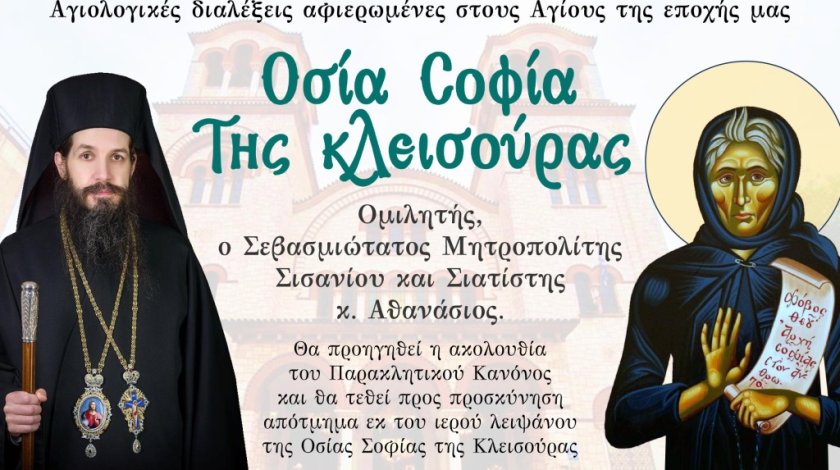 Την ερχόμενη Πέμπτη 23 Ιανουαρίου 2025 και ώρα 6:00 το απόγευμα, στον Ιερό Μητροπολιτικό Ναό Ζωοδόχου Πηγής Αγρινίου θα πραγματοποιηθεί η τέταρτη αγιολογική σύναξη, η οποία θα είναι αφιερωμένη στην Οσία Σοφία, την ασκήτρια της Κλεισούρας Καστοριάς.