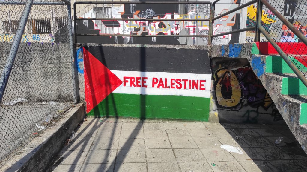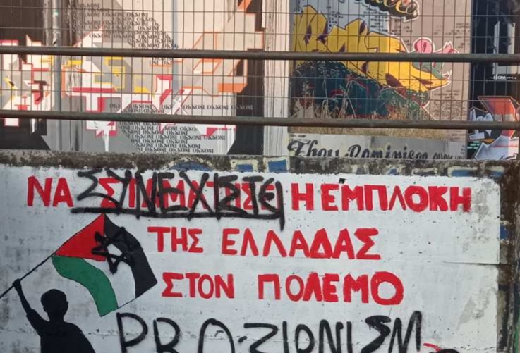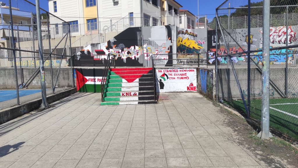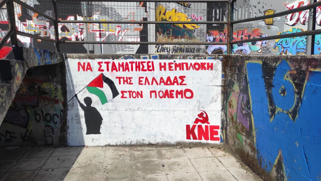 Άμεσα δυνάμεις της ΚΝΕ αποκατέστησαν τη σημαία της Παλαιστίνης και τα συνθήματα για καμιά συμμετοχή της Ελλάδας στον πόλεμο.