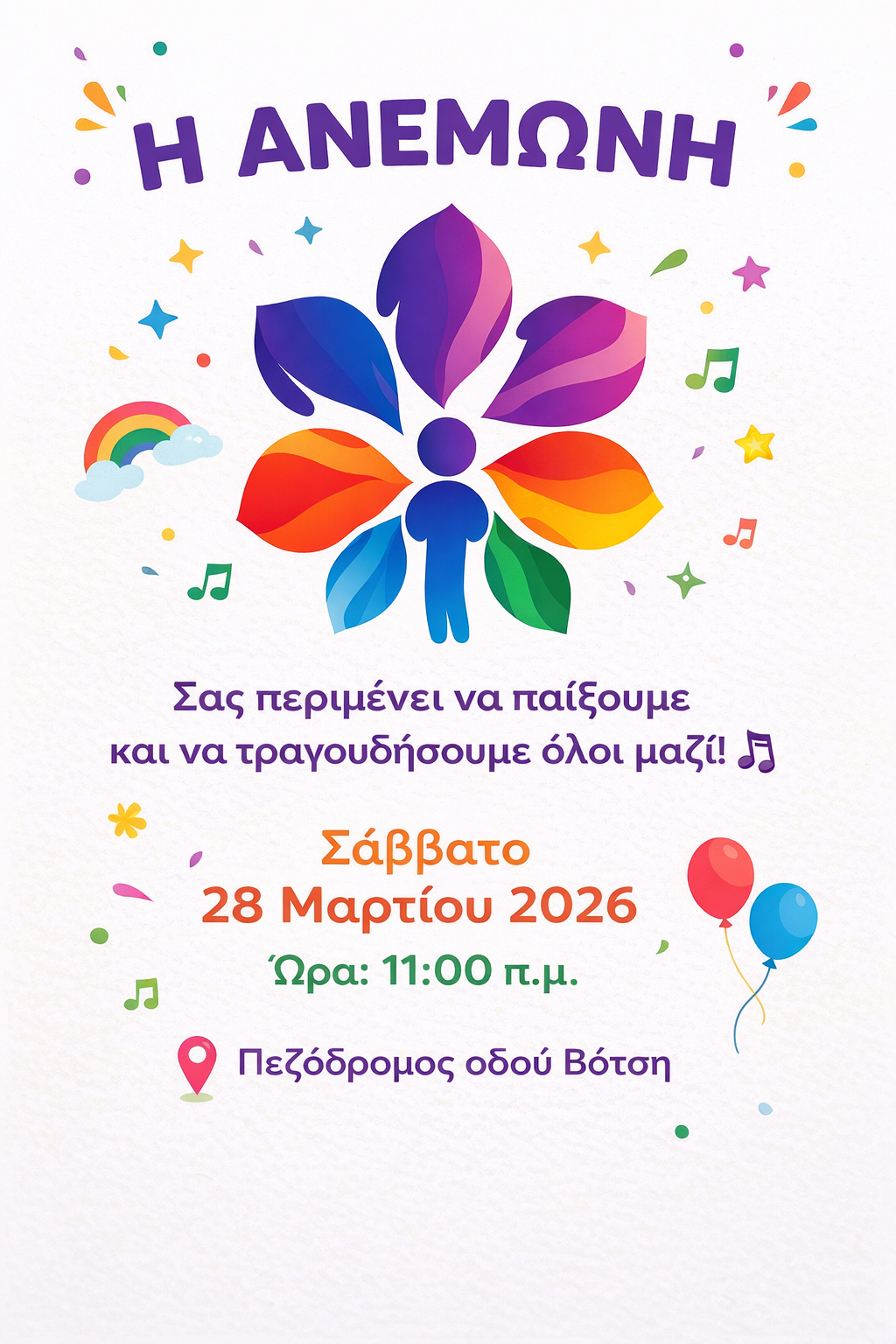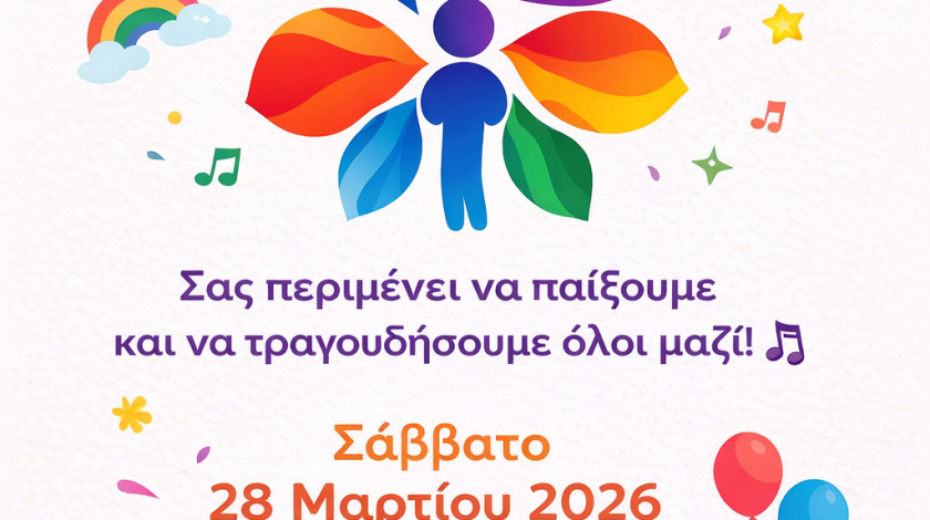 Αρχή ε το Σάββατο 28 Μαρτίου 2026 στις 11π.μ.. στον Πεζόδρομο της οδού Βότση ,όπου μικροί και μεγάλοι θα παίξουνε και θατραγουδήσουνε παρέα σε μια πράξη συμπερίληψης, στέλνοντας μήνυμα ισοτιμίας και κοινωνικής δικαιοσύνης.