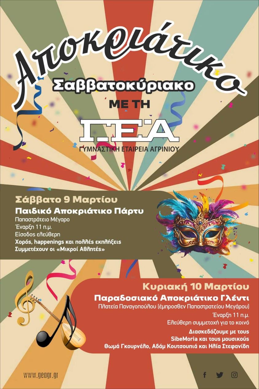 Αγρίνιο: Ένα ξεχωριστό Αποκριάτικο Σαββατοκύριακο με τη Γυμναστική Εταιρεία- Δείτε το πρόγραμμα 8 Μαρτίου 2024 AgrinioDaily Ένα ξεχωριστό Αποκριάτικο Σαββατοκύριακο με τη ΓΕΑ! Σας περιμένουμε να διασκεδάσουμε με μοντέρνους, αλλά και παραδοσιακούς καρναβαλικούς ρυθμούς! Η συμμετοχή είναι ελεύθερη για όλους!