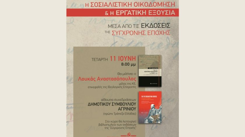 Εκδήλωση-συζήτηση με θέμα “Η σοσιαλιστική οικοδόμηση και η σοσιαλιστική εξουσία, μέσα από τις εκδόσεις της “Σύγχρονης Εποχής”: -Προς την Κεντρική Επιτροπή του ΚΚΣΕ (1965) του Μολότοφ Β. Μ.” και – Για το σοσιαλιστικό κράτος. Η ιστορία που διδάσκει, η ιστορία που μένει να γραφτεί”, θα πραγματοποιήσει η ΤΕ Αιτωλοακαρνανίας του ΚΚΕ, την Τετάρτη 11 Ιουνίου στις 8 μ.μ., στην αίθουσα συνεδριάσεων του Δημοτικού Συμβουλίου Αγρινίου (κτίριο πρώην ΤτΕ).