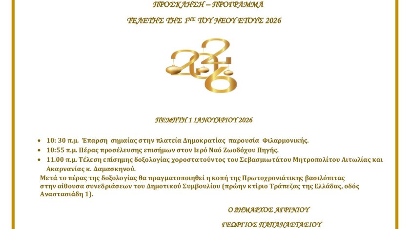 Ο Δήμος Αγρινίου προσκαλεί τους δημότες να τιμήσουν με την παρουσία τους τις επίσημες εορταστικές εκδηλώσεις για την υποδοχή του Νέου Έτους, οι οποίες θα πραγματοποιηθούν την Πέμπτη 1 Ιανουαρίου 2026 σύμφωνα με το ακόλουθο πρόγραμμα: