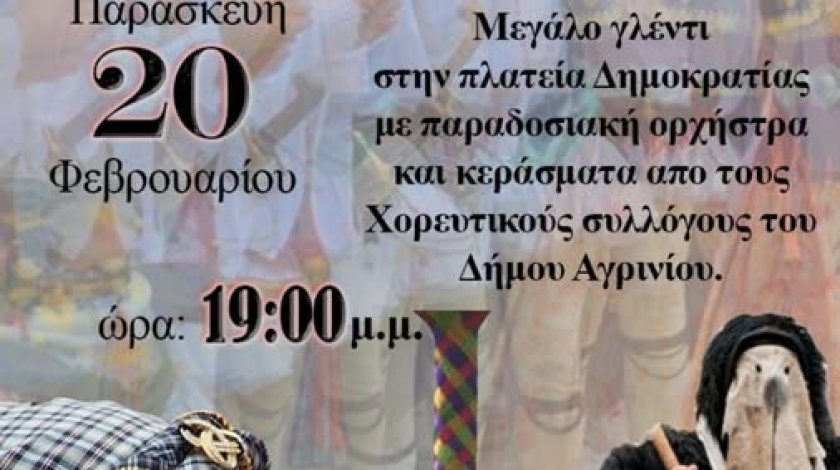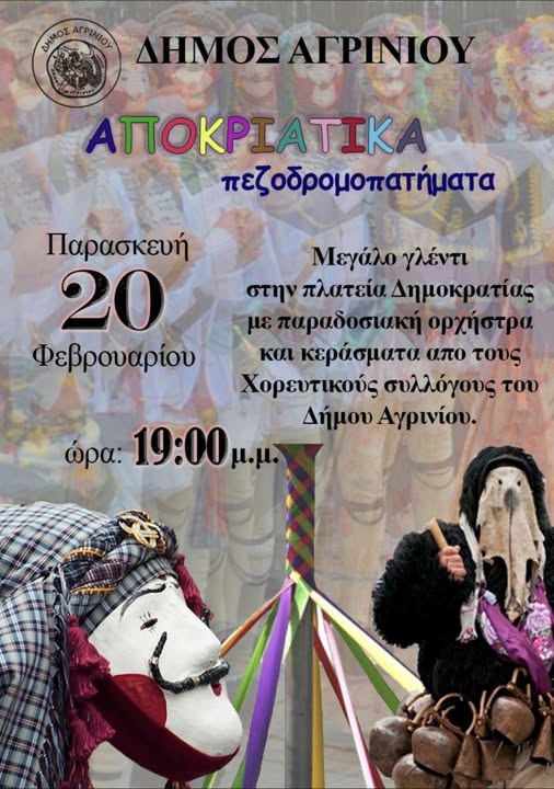 Ο Δήμος Αγρινίου προσκαλεί μικρούς και μεγάλους στα αποκριάτικα «Πεζοδρομοπατήματα» που θα πραγματοποιηθούν την Παρασκευή 20 Φεβρουαρίου, στις 7:00 το απόγευμα, στην Πλατεία Δημοκρατίας Αγρινίου.