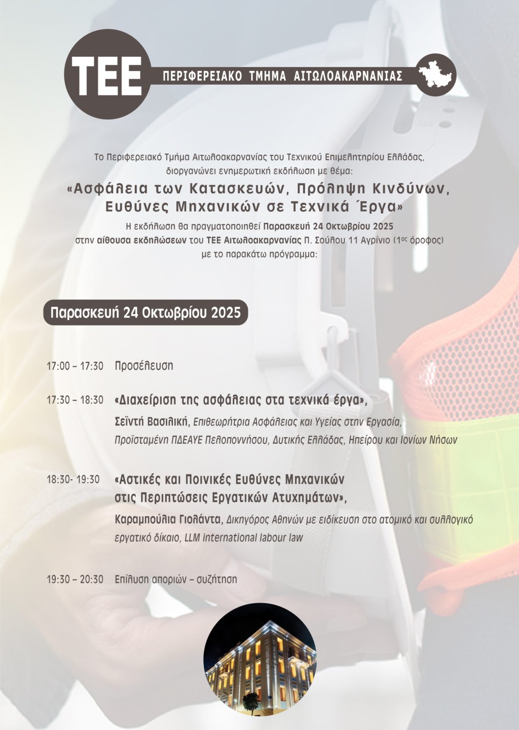 Σε εξέλιξη βρίσκεται αυτήν την ώρα η ενημερωτική εκδήλωση με θέμα:«Ασφάλεια των Κατασκευών, Πρόληψη Κινδύνων, Ευθύνες Μηχανικών σε Τεχνικά Έργα»,που διοργανώνει το ΤΕΕ Αιτωλοακαρνανίας .