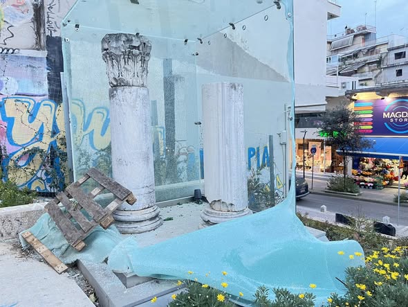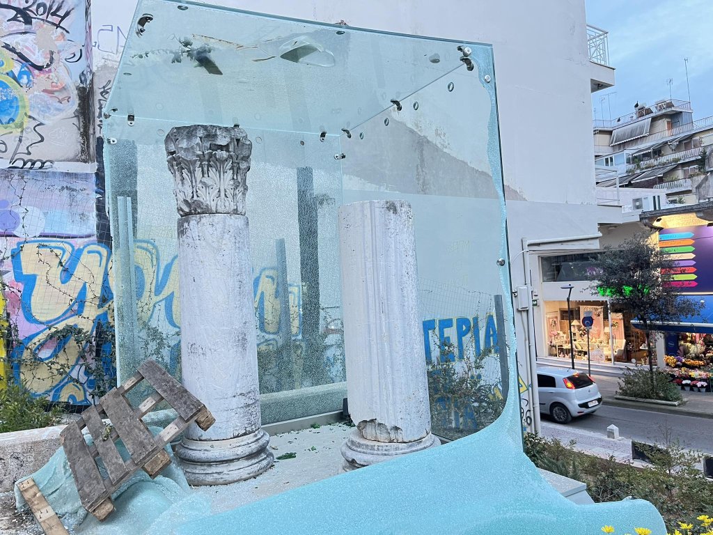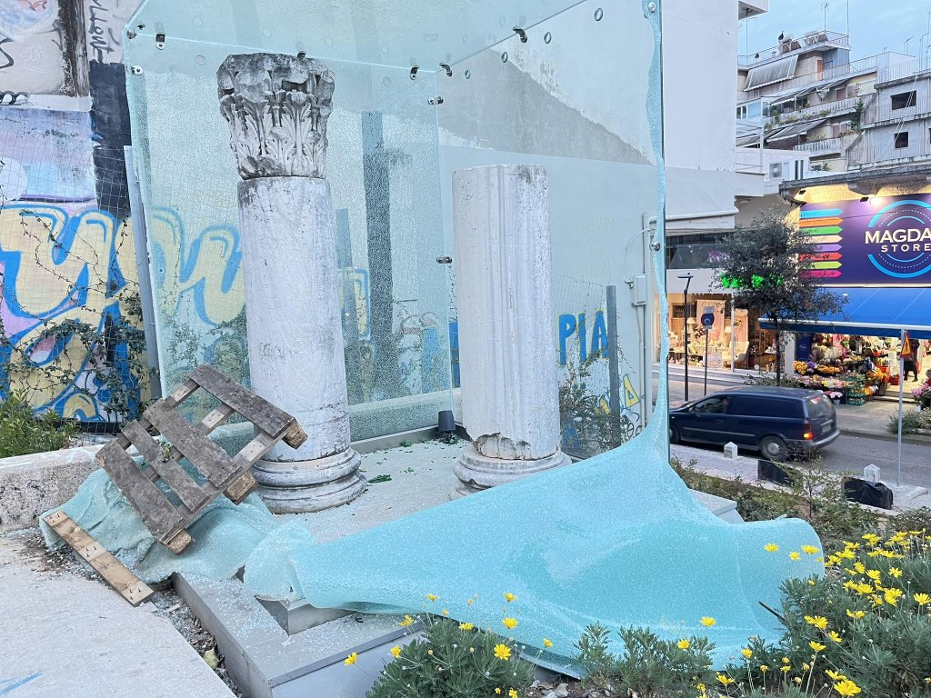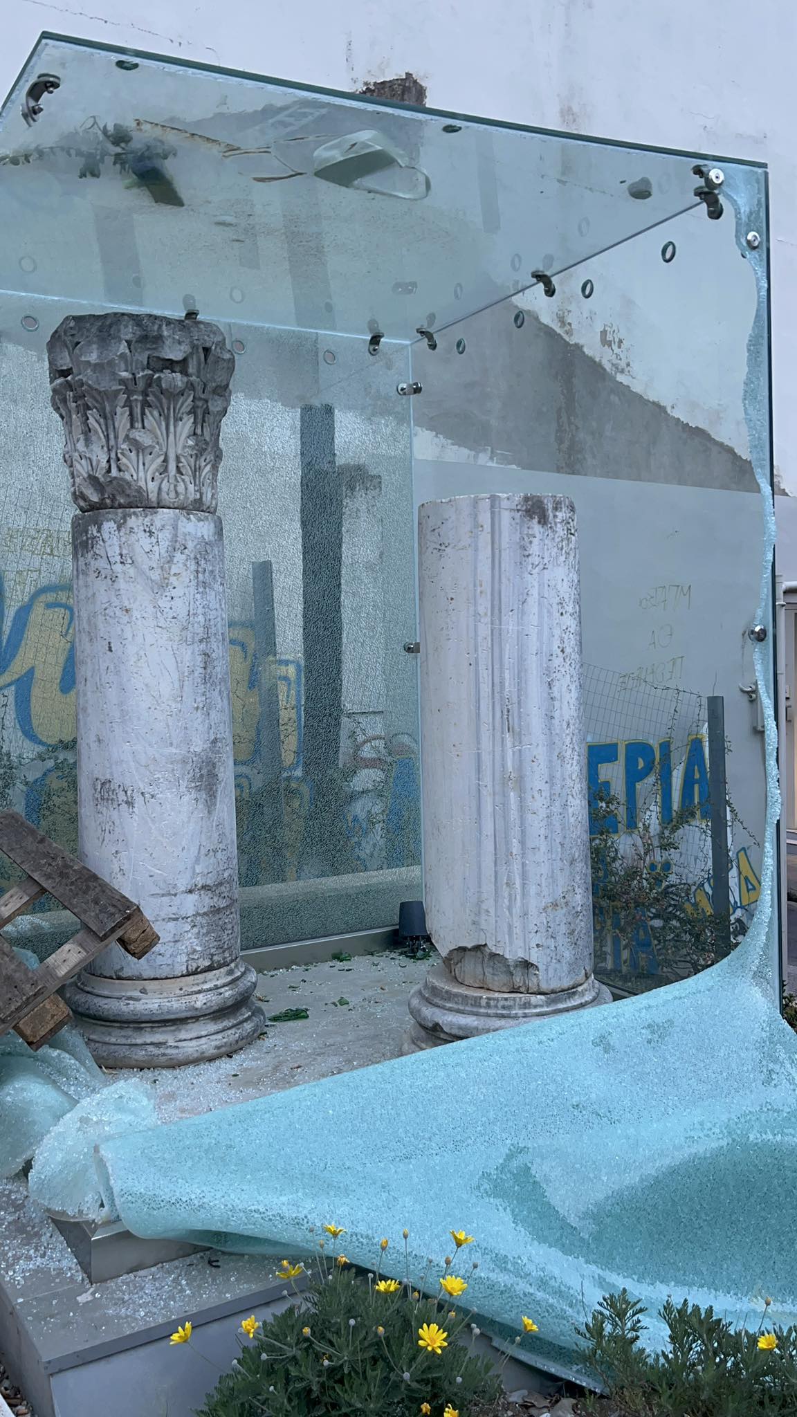 Οι άγνωστοι δράστες προκάλεσαν εκτεταμένες ζημιές στο πλέξιγκλας που είχε τοποθετηθεί ακριβώς για να διαφυλάξει τους ιστορικούς κίονες από φθορές και παρεμβάσεις.