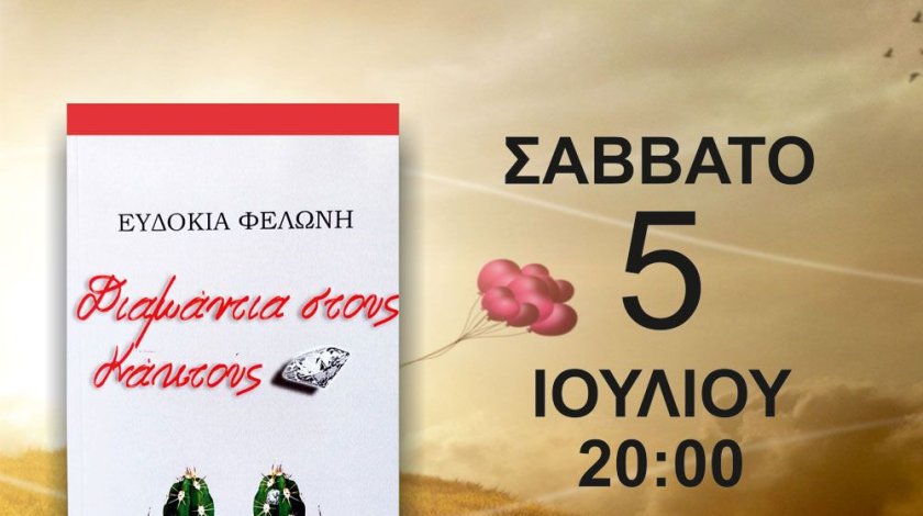 Παρουσίαση του βιβλίου της συγγραφέως Ευδοκίας Φελώνη «Διαμάντια στους κάκτους» διοργανώνει το Σάββατο 5 Ιουλίου στις 20:00 μ.μ. ο Δήμος Αμφιλοχίας και η Δημοτική Βιβλιοθήκη “Π. Κόκκαλης” στον αύλειο χώρο της βιβλιοθήκης.