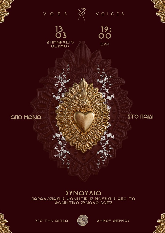 Μια ξεχωριστή μουσική βραδιά, αφιερωμένη στην ελληνική παράδοση και τη δύναμη της ανθρώπινης φωνής, θα έχουν την ευκαιρία να απολαύσουν οι κάτοικοι και οι επισκέπτες του Θέρμου. Το καταξιωμένο φωνητικό σύνολο VOÉS (Voices) παρουσιάζει τη συναυλία «Από Μάνα στο Παιδί», την Παρασκευή 13 Μαρτίου 2026 και ώρα 19:00, στην αίθουσα εκδηλώσεων του Δημαρχιακού Μεγάρου Θέρμου.