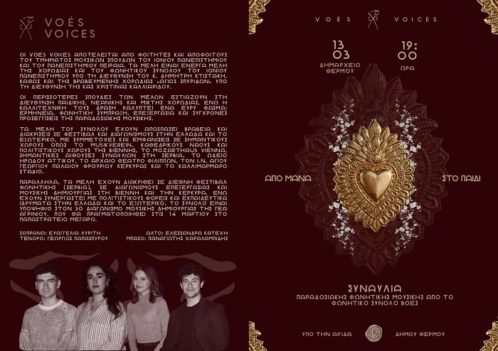 Υπό την αιγίδα του Δήμου Θέρμου, το σχήμα VOÉS θα ερμηνεύσει ένα πλούσιο πρόγραμμα παραδοσιακής φωνητικής μουσικής. Από τους σκοπούς του Πόντου και της Μικράς Ασίας, μέχρι τα τραγούδια του Αιγαίου, της Ρόδου και της Μακεδονίας, η συναυλία υπόσχεται να συγκινήσει, αναδεικνύοντας τη διαχρονική σχέση της παράδοσης που μεταφέρεται από γενιά σε γενιά.