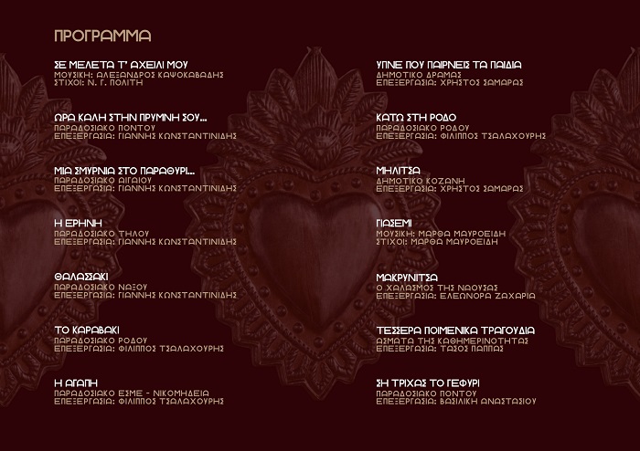 «Ύπνε που παίρνεις τα παιδιά» (Δράμα) …καθώς και σύγχρονες συνθέσεις και επεξεργασίες από σπουδαίους δημιουργούς όπως ο Γιάννης Κωνσταντινίδης, ο Φίλιππος Τσαλαχούρης και η Μάρθα Μαυροειδή.
