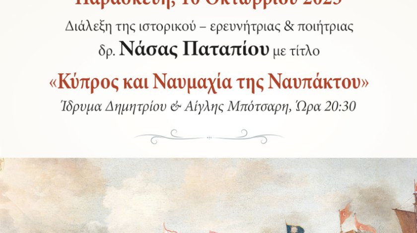 Στο πλαίσιο των Εορτασμών της 454ης Επετείου της Ναυμαχίας της Ναυπάκτου ο Δήμος Ναυπακτίας προσκαλεί όλους στη διάλεξη της ιστορικού-ερευνήτριας και ποιήτριας Δρος Νάσα Παταπίου με θέμα «Κύπρος και Ναυμαχία της Ναυπάκτου» που θα πραγματοποιηθεί απόψε Παρασκευή, 10 Οκτωβρίου 2025 και ώρα 20:30’ στο Ίδρυμα Δημητρίου και Αίγλης Μπότσαρη.