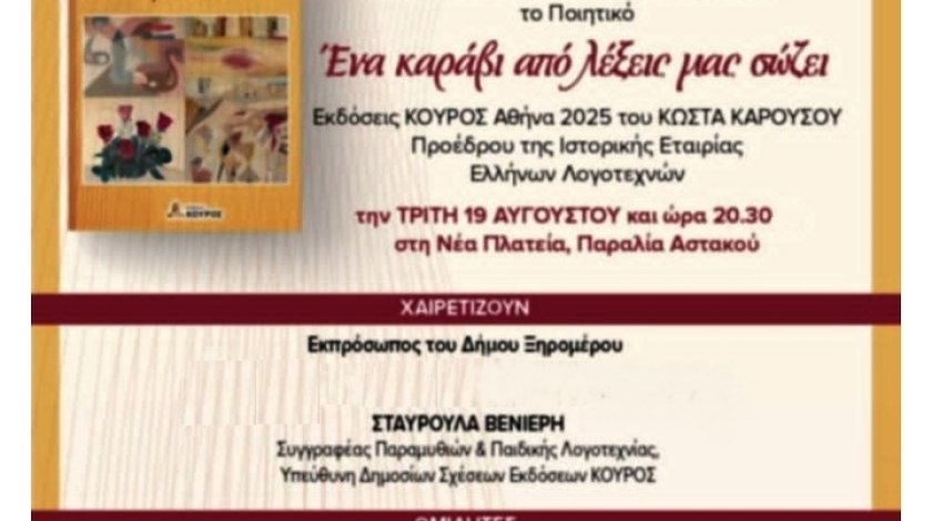 Εκδόσεις ΚΟΥΡΟΣ Αθήνα 2025 του ΚΩΣΤΑ ΚΑΡΟΥΣΟΥ, Προέδρου της Ιστορικής Εταιρίας Ελλήνων Λογοτεχνών την ΤΡΙΤΗ 19 ΑΥΓΟΥΣΤΟΥ και ώρα 20.30 στη Νέα Πλατεία, Παραλία Αστακού.