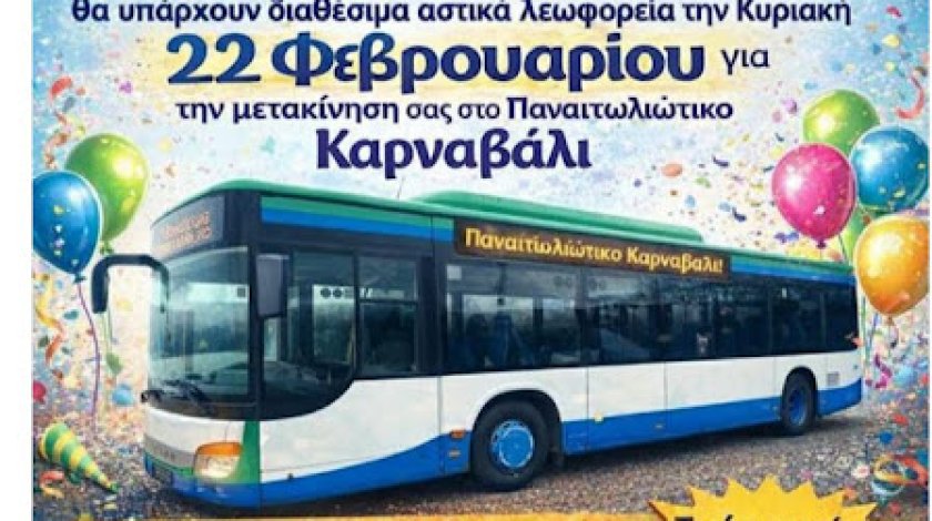 Ο καρναβαλικός σύλλογος Παναιτωλίου είναι στην ευχάριστη θέση να σας ανακοινώσει ότι θα υπάρχουν διαθέσιμα αστικά λεωφορεία την Κυριακή 22 Φεβρουαρίου για την μετακίνηση σας στο Παναιτωλιώτικο