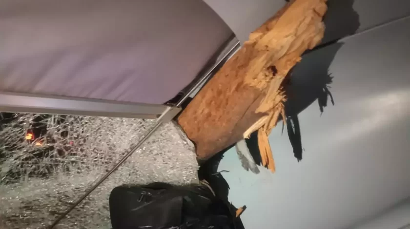 Στις φωτογραφίες φαίνονται τα τεράστια κλαδιά του τρένου να έχουν σπάσει το παρμπρίζ του τρένου έχουν μπει μέσα στην καμπίνα του οδηγού.
