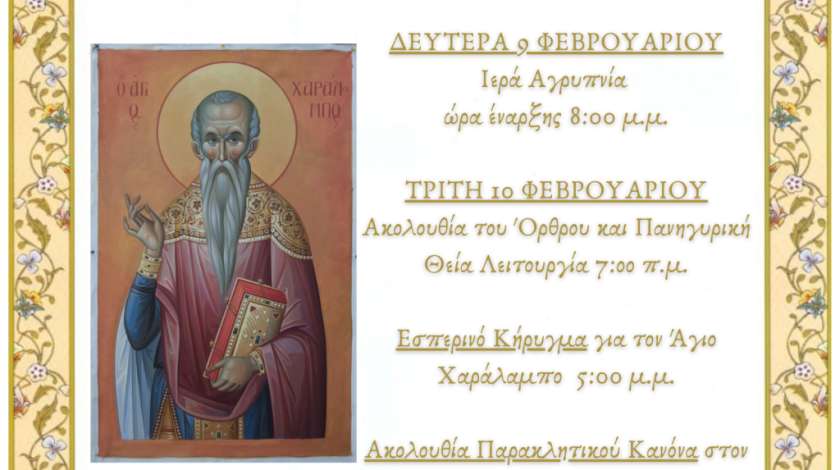 Η εορτή του Αγίου Χαραλάμπους στον Ιερό Μητροπολιτικό Ναό Ζωοδόχου Πηγής Αγρινίου Την Τρίτη 10 Φεβρουαρίου 2026 η αγία μας Εκκλησία εορτάζει την ιερά μνήμη του Αγίου Ενδόξου Ιερομάρτυρος Χαραλάμπους του Θαυματουργού. Στο Ιερό Μητροπολιτικό Ναό Ζωοδόχου Πηγής Αγρινίου, όπου φυλάσσεται Ιερό Λείψανο του Αγίου Χαραλάμπους τιμάται ιδιαιτέρως η μνήμη του κατά το ακόλουθο πρόγραμμα: Την Δευτέρα 9 Φεβρουαρίου θα τελεσθεί Ιερά Αγρυπνία η οποία θα αρχίσει ώρα 20:00’ μ.μ. Την Τρίτη 10 Φεβρουαρίου θα τελεσθεί η Ακολουθία του Όρθρου και η πανηγυρική Θεία Λειτουργία στις 7:00’ π.μ. Το απόγευμα…