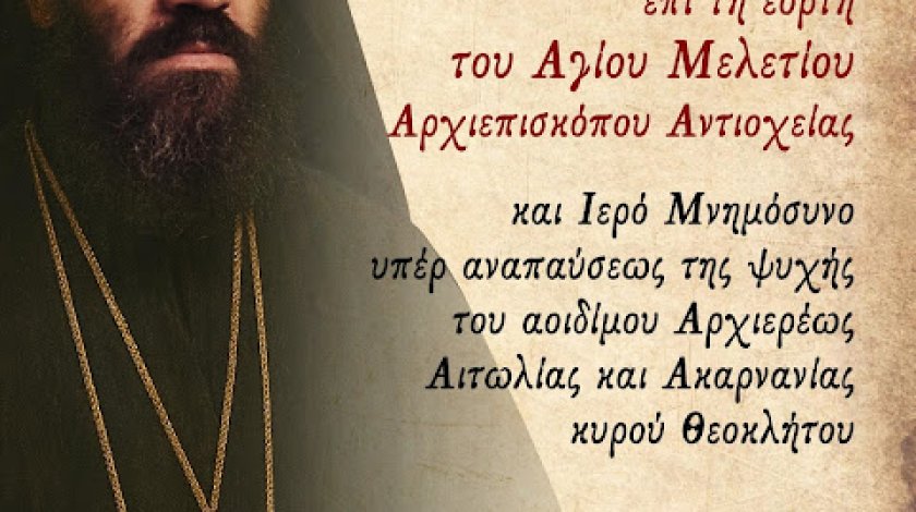Από την Ιερά Μονή Αγίας Ελεούσης Κλεισούρας Μεσολογγίου ανακοινώνεται ότι, την Τετάρτη 11 Φεβρουαρίου το βράδυ, θα τελεσθεί Ιερά Αγρυπνία, επί τη εορτή του Αγίου Μελετίου Αρχιεπισκόπου Αντιοχείας. Επίσης ανακοινώνεται, ότι με την συμπλήρωση 19 ετών από την κοίμηση του αειμνήστου Μητροπολίτου Αιτωλίας και Ακαρνανίας κυρού Θεοκλήτου (Αβραντινή), μετά το πέρας της αγρυπνίας, θα τελεσθεί Ιερό Μνημόσυνο υπέρ αναπαύσεως της ψυχής του αοιδίμου Αρχιερέως. Η Ιερά Αγρυπνία θα ξεκινήσει 08:30 μ.μ. και θα τελειώσει 00:30 π.μ. Εκ της Ιεράς Μονής