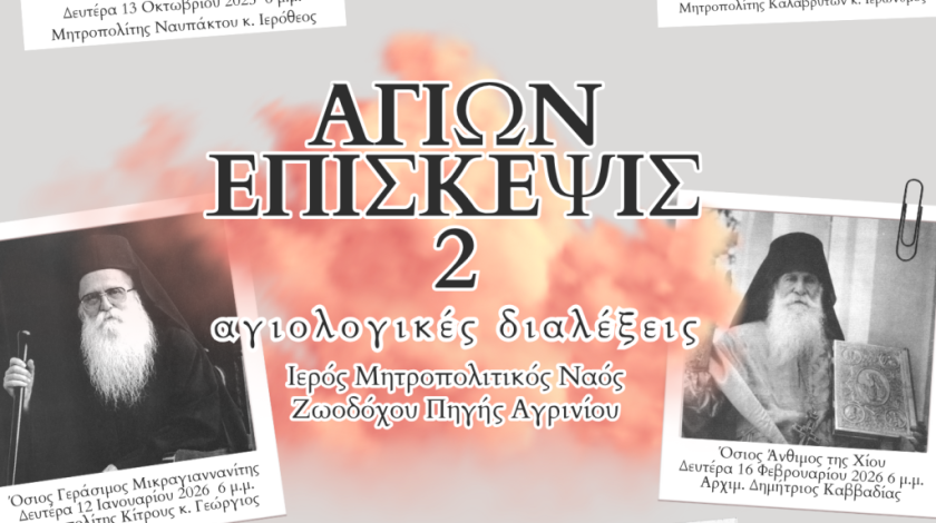 Συνεχίζονται οι αγιολογικές διαλέξεις στον Ιερό Μητροπολιτικό Ναό Ζωοδόχου Πηγής Αγρινίου, με γενικό τίτλο «Αγίων Επίσκεψις 2», οι οποίες είναι αφιερωμένες σε νεοφανείς Αγίους της εποχής μας. Σκοπός των διαλέξεων αυτών είναι να αντληθούν διδάγματα ζωής από Αγίους που έζησαν στα χρόνια μας, αντιστάθηκαν στο εκκοσμικευμένο πνεύμα της εποχής μας και απέδειξαν, ότι η Αγιότητα δεν είναι μια ξεπερασμένη υπόθεση του χθες, αλλά η διαχρονική εμπειρία της Εκκλησίας και η σταθερή προοπτική όλων μας Την Δευτέρα 15 Δεκεμβρίου 2025 και ώρα 6:00’ το απόγευμα, στον Ιερό Μητροπολιτικό Ναό Ζωοδόχου…
