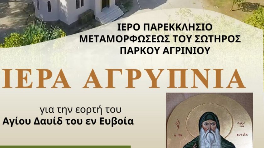 Την Παρασκευή 31 Οκτωβρίου 2025 στο Ιερό Παρεκκλήσιο Μεταμορφώσεως του Σωτήρος Χριστού που βρίσκεται εντός του Παπαστρατείου Δημοτικού Πάρκου Αγρινίου, θα τελεσθεί Ιερά Αγρυπνία για την εορτή του Αγίου Δαυίδ του Γέροντος του εν Ευβοία. Η Ιερά Αγρυπνία θα αρχίσει στις 21:00’ και θα ολοκληρωθεί στις 00:00’.