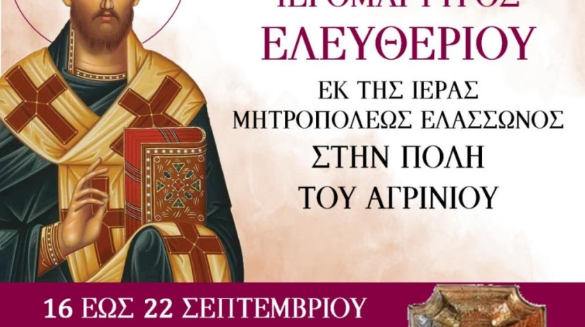 Την Τιμία Κάρα του Αγίου ενδόξου Ιερομάρτυρος Ελευθερίου θα υποδεχθεί η Ενορία της Αγίας Βαρβάρας Αγρινίου την Τρίτη 16 Σεπτεμβρίου 2025 και ώρα 6:30’ το απόγευμα. Η επίσημη υποδοχή θα πραγματοποιηθεί στα προπύλαια του Ιερού Ναού από τον Σεβασμιώτατο Μητροπολίτη Αιτωλίας και Ακαρνανίας κ. Δαμασκηνό, τον Ιερό Κλήρο, τις Αρχές και τον πιστό λαό της πόλεως. Αμέσως μετά θα τελεστεί η Ακολουθία του Αρχιερατικού Εσπερινού, χοροστατούντος του Σεβασμιωτάτου Ποιμενάρχου μας κ. Δαμασκηνού. Το Ιερό Λείψανο προέρχεται από τον Ιερό Ναό Αγίου Νικολάου Καρυάς Ελασσώνος, της Ιεράς Μητροπόλεως Ελασσώνος. Θα παραμείνει…