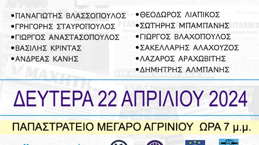 Τη Δευτέρα 22 Απριλίου 2024 και ωρα 7 μ.μ. στο Παπαστράτειο Μέγαρο Αγρινίου, θα πραγματοποιηθεί εκδήλωση με τίτλο: «Τιμή στη μνήμη των Βετεράνων του Τοπικού Τύπου που έφυγαν». Η εκδήλωση διοργανώνεται από τις Εβδομαδιαίες Εφημερίδες ΜΑΧΗΤΗΣ και ΠΑΛΜΟΣ ΑΙΤΩΛΟΚΑΡΝΑΝΙΑΣ, συνδιοργανωτές επίσης είναι ο τ. Πράκτορας Εφημερίδων κ. Βλάσης Αλμπάνης και Τεχνική Υποστήριξη παρέχει ο Δημοτικός Υπάλληλος κ. Μιλτιάδης Γρηγορόπουλος. Οι απελθόντες εκδότες – δημοσιογράφοι που θα τιμηθούν είναι : • ΠΑΝΑΓΙΩΤΗΣ ΒΛΑΣΣΟΠΟΥΛΟΣ • ΓΡΗΓΟΡΗΣ ΣΤΑΥΡΟΠΟΥΛΟΣ • ΓΙΩΡΓΟΣ ΑΝΑΣΤΑΣΟΠΟΥΛΟΣ • ΒΑΣΙΛΗΣ ΚΡΙΝΤΑΣ • ΑΝΔΡΕΑΣ ΚΑΝΗΣ • ΘΕΟΔΩΡΟΣ ΛΙΑΠΙΚΟΣ • ΣΩΤΗΡΗΣ…