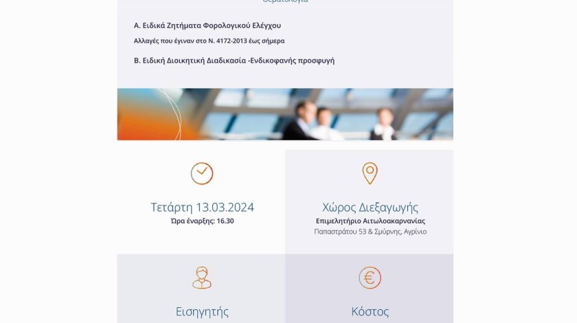 Η Ένωση Λογιστών – Φοροτεχνικών Επαγγελματιών Αιτωλοακαρνανίας διοργανώνει Φορολογικό σεμινάριο στις 13/03/2024 ημέρα Τετάρτη & ώρα 4:30 μμ στην αίθουσα του Επιμελητηρίου Αιτωλοακαρνανίας, Παπαστράτου 53 & Σμύρνης, Αγρίνιο. “Ειδικά Ζητήματα Φορολογικού Ελέγχου – Ενδικοφανής Προσφυγή” Εισηγητής του σεμιναρίου θα είναι ο Αντώνης Νασόπουλος.