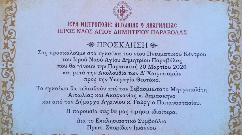 Τα εγκαίνια του νέου Πνευματικού Κέντρου του Ιερού Ναού Αγίου Δημητρίου Παραβόλας θα πραγματοποιηθούν την Παρασκευή 20 Μαρτίου 2026, μετά την Ακολουθία των Δ΄ Χαιρετισμών προς την Υπεραγία Θεοτόκο. Την τελετή των εγκαινίων θα τελέσει ο Σεβασμιώτατος Μητροπολίτης Αιτωλίας και Ακαρνανίας κ. Δαμασκηνός, ενώ στην εκδήλωση θα παραστεί και ο Δήμαρχος Αγρινίου κ. Γεώργιος Παπαναστασίου. Η δημιουργία του νέου Πνευματικού Κέντρου αποτελεί μια σημαντική πρωτοβουλία για την ενορία της Παραβόλας, καθώς ο χώρος θα φιλοξενεί πνευματικές, πολιτιστικές και κοινωνικές δραστηριότητες της τοπικής κοινότητας. Η εκκλησιαστική επιτροπή του Ιερού Ναού…