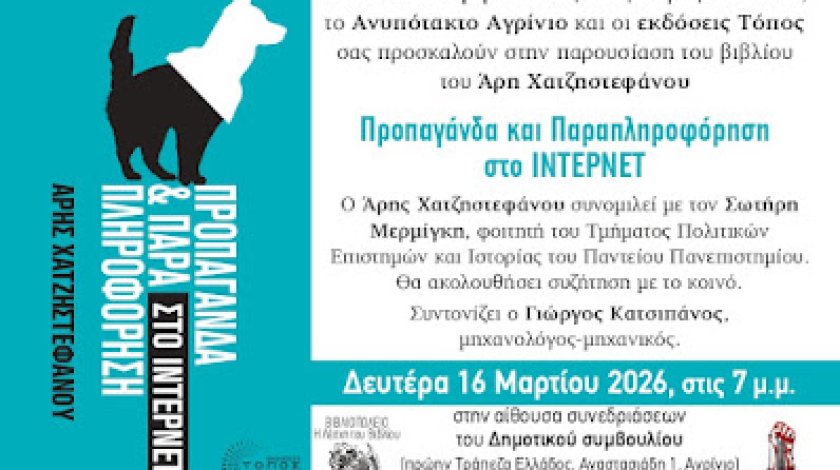 Η Λέσχη του Βιβλίου της Αλεξάνδρας Μοσχονά, το Ανυπότακτο Αγρίνιο και οι εκδόσεις Τόπος διοργανώνουν την παρουσίαση του βιβλίου του δημοσιογράφου και συγγραφέα Άρη Χατζηστεφάνου με τίτλο «Προπαγάνδα και Παραπληροφόρηση στο Internet», τη Δευτέρα 16 Μαρτίου, στις 7:00 μ.μ., στην αίθουσα συνεδριάσεων του Δημοτικού Συμβουλίου Αγρινίου (πρώην Τράπεζα Ελλάδος, Αναστασιάδη 1) Το βιβλίο εξετάζει τους μηχανισμούς παραγωγής και διάδοσης της προπαγάνδας στη σύγχρονη ψηφιακή εποχή, τον ρόλο των αλγορίθμων και των μέσων κοινωνικής δικτύωσης, καθώς και τις επιπτώσεις της παραπληροφόρησης στη δημόσια σφαίρα και τη δημοκρατική λειτουργία. Στην εκδήλωση ο…