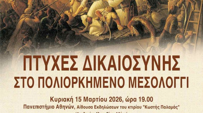 Η Ιερά Μητρόπολη Αιτωλίας και Ακαρνανίας, σε συνεργασία με την Εταιρεία Ελλήνων Δικαστικών Λειτουργών για την Δημοκρατία και τις Ελευθερίες διοργανώνει εκδήλωση με θέμα: «Πτυχές Δικαιοσύνης στο πολιορκημένο Μεσολόγγι». Η εκδήλωση εντάσσεται στο επετειακό πρόγραμμα των εορταστικών δράσεων της Ιεράς Μητροπόλεως Αιτωλίας και Ακαρνανίας για την επέτειο των 200 ετών από την Ηρωική Έξοδο της Φρουράς του Μεσολογγίου. Θα πραγματοποιηθεί στην Αθήνα, στο Πανεπιστήμιο Αθηνών, στην αίθουσα εκδηλώσεων του κτιρίου «Κωστής Παλαμάς» (Ακαδημίας 48 και Σίνα), την Κυριακή 15 Μαρτίου 2026 και ώρα 19:00’ το απόγευμα. Εισηγητές θα είναι: ο…