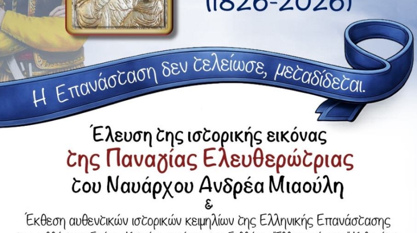 Την Ιερά και Ιστορική Εικόνα της Παναγίας της Ελευθερώτριας, του Ναυάρχου Ανδρέα Μιαούλη, εκ του Ιερού Ναού Αναλήψεως του Κυρίου Νέου Κόσμου, της Ιεράς Αρχιεπισκοπής Αθηνών θα υποδεχθεί ο Ιερός Ναός της Αγίας Βαρβάρας Αγρινίου. Η επίσημη υποδοχή της ιεράς Εικόνος θα πραγματοποιηθεί την Δευτέρα 9 Μαρτίου 2026 και ώρα 5:00’ το απόγευμα στα προπύλαια του Ιερού Ναού Αγίας Βαρβάρας από τον Σεβασμιώτατο Μητροπολίτη Αιτωλίας και Ακαρνανίας κ. Δαμασκηνό. Στην συνέχεια θα τελεστεί η Ακολουθία του Μεγάλου Αποδείπνου, χοροστατούντος του Σεβασμιωτάτου. Αμέσως μετά στο Ενοριακό Πνευματικό Κέντρο του Ιερού…