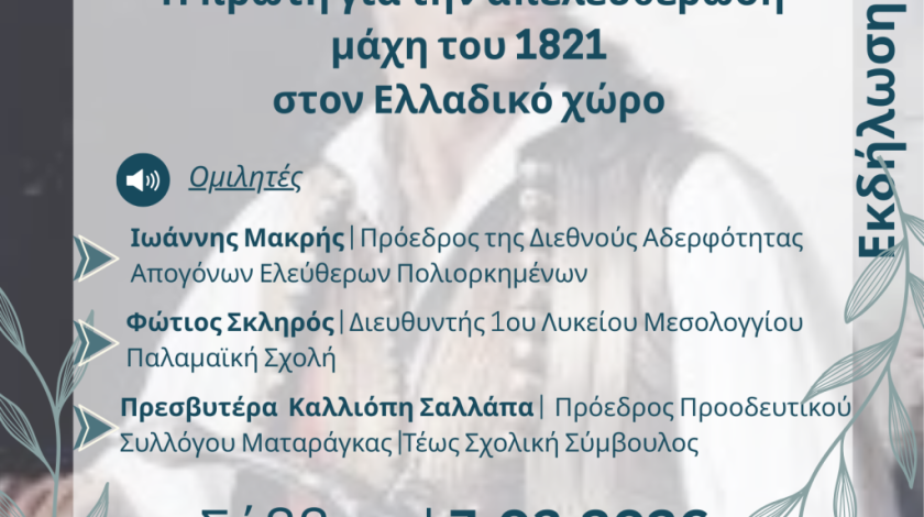 Η Ομοσπονδία Συλλόγων Απανταχού Μακρύνειων Αιτωλοακαρνανίας, σε συνεργασία με τον Δήμο Αγρινίου, σας προσκαλεί στην εκδήλωση Ιστορικής Μνήμης και Τιμής για την έναρξη της Ελληνικής Επανάστασης, το Σάββατο 7 Μαρτίου 2026 και ώρα 19:30 στο Δημοτικό Σχολείο Κάτω Μακρυνούς. Τιμούμε την πρώτη επαναστατική ενέργεια στον Eλλαδικό χώρο, που πραγματοποιήθηκε στις 5 Μαρτίου 1821 στη θέση «Σκάλα του Μαυροματιού» στο Περιθώρι Ναυπακτίας, από το Δημήτριο Μακρή και τους οπλαρχηγούς του Ζυγού. Αποδίδουμε τον ελάχιστο οφειλόμενο φόρο τιμής στους προγόνους μας, διατηρώντας ζωντανή την ιστορική μνήμη και την παρακαταθήκη της Eλευθερίας. Η παρουσία σας θα αποτελέσει ιδιαίτερη τιμή για εμάς. Παναγιώτης Χ. Καζανάς Ο Πρόεδρος του Δ.Σ.