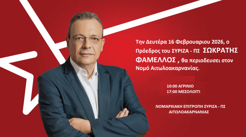 Την Αιτωλοακαρνανία θα επισκεφθεί τη Δευτέρα 16 Φεβρουαρίου 2026 ο Πρόεδρος του ΣΥΡΙΖΑ-Προοδευτική Συμμαχία, Σωκράτης Φάμελλος, στο πλαίσιο της περιοδείας του στην περιοχή. Η επίσκεψη θα ξεκινήσει στις 10:00 το πρωί από το Αγρίνιο, όπου θα πραγματοποιήσει συναντήσεις και επαφές με φορείς και πολίτες της περιοχής. Στη συνέχεια, στις 17:00 το απόγευμα, θα μεταβεί στο Μεσολόγγι για σειρά επαφών . Η περιοδεία εντάσσεται στον ευρύτερο κύκλο παρεμβάσεων και διαλόγου του ΣΥΡΙΖΑ-ΠΣ με τις τοπικές κοινωνίες, με στόχο την ανάδειξη των προβλημάτων της περιοχής και τη διαμόρφωση προτάσεων για την ανάπτυξη…