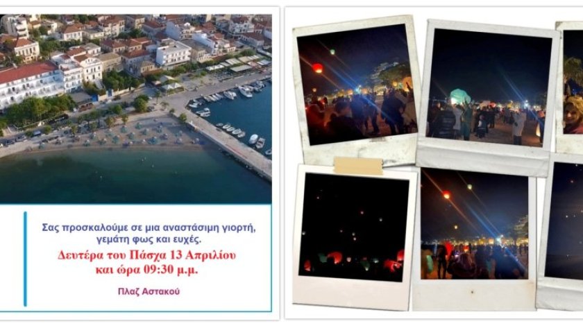 Ο Δήμος Ξηρομέρου και η Κοινότητα Αστακού, σας προσκαλούν να παραβρεθείτε τη Δευτέρα του Πάσχα 13 Απριλίου και ώρα 09:30 μ.μ. στην πλάζ του Αστακού, σε μία αναστάσιμη γιορτή, γεμάτη φως και ευχές. Δεκάδες φαναράκια θα ανάψουν και θα αφεθούν στον ουρανό του Αστακού, συνοδεία των καλύτερων ευχών μας. Η Κοινότητα Αστακού σας εύχεται Καλό Πάσχα και Καλή Ανάσταση.