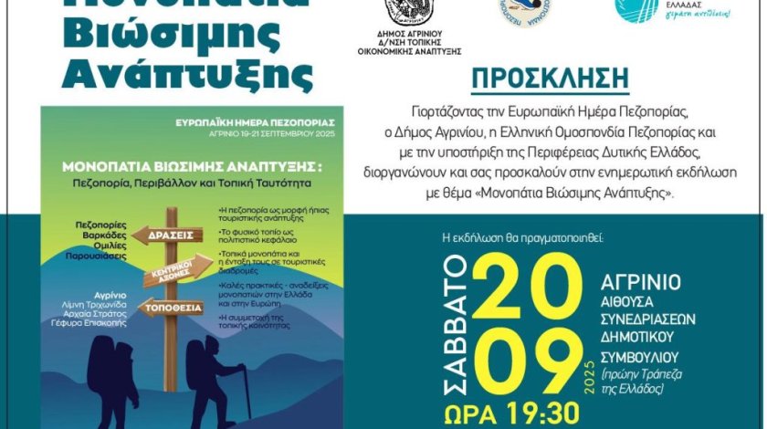 Με αφορμή την Ευρωπαϊκή Ημέρα Πεζοπορίας, σε συνεργασία με την Περιφέρεια Δυτικής Ελλάδας και υπό τον συντονισμό της ΑΜΚΕ ΕΠΠΙ-Δρούμε, διοργανώνεται τριήμερο εκδηλώσεων στις 19–21 Σεπτεμβρίου 2025. Στο πλαίσιο των δράσεων, θα πραγματοποιηθεί Ανοιχτή Εκδήλωση το Σάββατο 20 Σεπτεμβρίου 2025, ώρα 19:30, στην Αίθουσα Συνεδριάσεων του Δημοτικού Συμβουλίου Αγρινίου (κτίριο Τράπεζας της Ελλάδος). Καταξιωμένοι πεζοπόροι και εκπρόσωποι της Ελληνικής Ομοσπονδίας Πεζοπορίας θα παρουσιάσουν εισηγήσεις και προτάσεις με στόχο την ανάδειξη του βιωματικού – εναλλακτικού τουρισμού στην περιοχή μας. Εκδήλωση για τον Πεζοπορικό Τουρισμό – Δημαρχείο Αγρινίου Ομιλίες & Παρουσιάσεις από την Ελληνική Ομοσπονδία Πεζοπορίας και σημαντικούς…