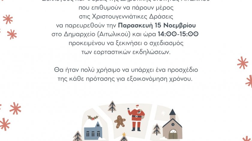 Ο Δήμος Ιερής Πόλης Μεσολογγίου καλεί τους ενδιαφερόμενους Συλλόγους και Φορείς της Δημοτικής Ενότητας Αιτωλικού που επιθυμούν να πάρουν μέρος στις Χριστουγεννιάτικες Δράσεις να παρευρεθούν την Παρασκευή 15 Νοεμβρίου 2024 στο Δημαρχείο Αιτωλικού και ώρα 14:00-15:00 προκειμένου να ξεκινήσει ο σχεδιασμός των εορταστικών εκδηλώσεων.