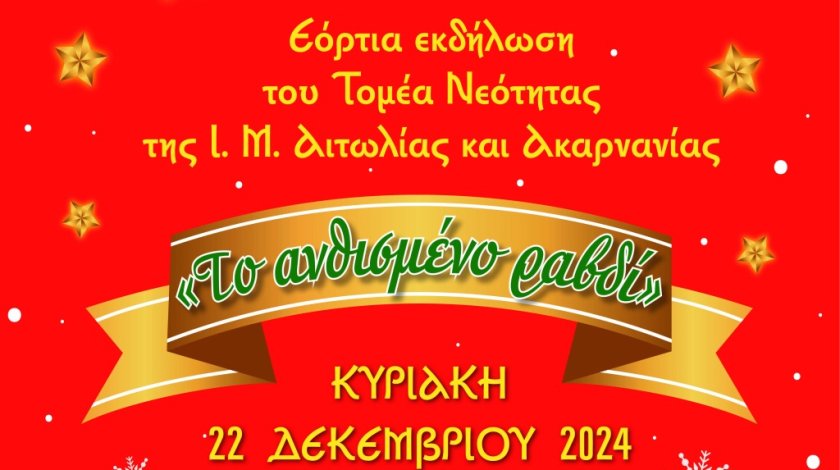 Χριστουγεννιάτικη εκδήλωση στο Αγρίνιο θα πραγματοποιήσει ο Τομέας Νεότητος της Ιεράς Μητροπόλεως Αιτωλίας και Ακαρνανίας την Κυριακή 22 Δεκεμβρίου 2024 και ώρα 18:00’, στην αίθουσα εκδηλώσεων του Παπαστρατείου Μεγάρου Αγρινίου.