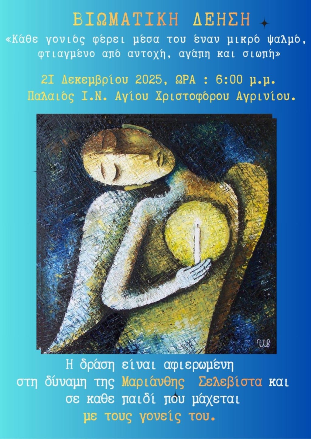Με χαρά και σεβασμό σας προσκαλούμε σε μια ξεχωριστή Χριστουγεννιάτικη Βιωματική Δέηση, φωτισμένη μόνο από το φως των κεριών σε έναν χώρο σιωπής, ρυθμού και κοινής ανάσας, στις 21 Δεκεμβρίου 2025, ώρα 6:00 μ.μ., στον Παλαιό Ιερό Ναό Αγίου Χριστοφόρου Αγρινίου.