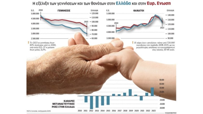 Οπως επισημαίνει ο κ. Χολέζας, στην περιοδική έκδοση του ΚΕΠΕ «Οικονομικές εξελίξεις», μέχρι τα τέλη της δεκαετίας του 2000 οι γεννήσεις στην Ελλάδα ακολουθούσαν ανοδική πορεία, όπως και στην Ε.Ε. Μετά το 2010, η τάση αντιστράφηκε δραματικά: το 2023 οι γεννήσεις ήταν 40% λιγότερες από το 2000, ενώ στην Ε.Ε.-27 η μείωση ήταν μόλις 21,5%. Στους θανάτους, η αύξηση ήταν σταθερή και εντάθηκε τα χρόνια της πανδημίας, με μικρή μόνο κάμψη μετά το 2021. Μάλιστα, παρά την αναμενόμενη επιμήκυνση του προσδόκιμου ζωής (80,5 έτη για τους άνδρες και 85,5 για τις γυναίκες έως το 2030), η γήρανση του πληθυσμού σημαίνει ότι οι απώλειες θα συνεχιστούν.