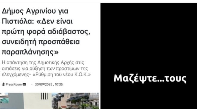 Το παρακινητικό «μαζέψτε …τους» του δημάρχου Αγρινίου που συνοδεύει τον σχολιασμό του σε ανάρτηση του επικεφαλής της μείζονος αντιπολίτευσης του Δημοτικού Συμβουλίου είναι ταυτόχρονα και αποκαλυπτικό, για όσους μπορούν να διαβάζουν πίσω από τις λέξεις.
