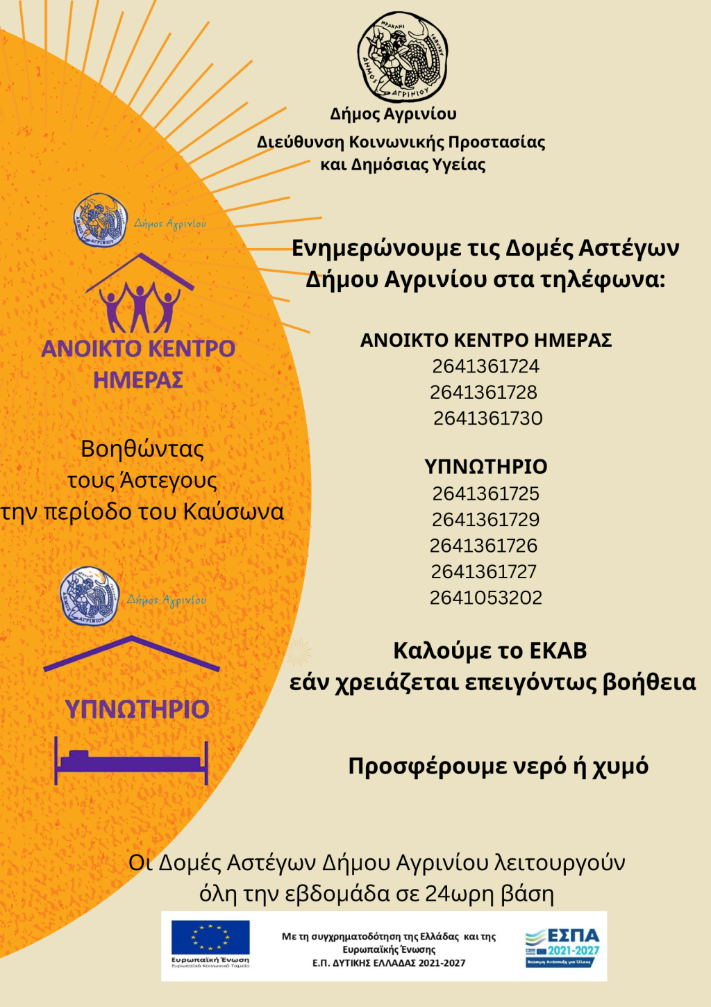 Οι Δομές Αστέγων του Δήμου Αγρινίου (συνέχιση δράσης) έχουν ενταχθεί στο επιχειρησιακό πρόγραμμα της Δυτικής Ελλάδας ΕΣΠΑ 2021-2027 με κωδικό ΟΠΣ 6001977.