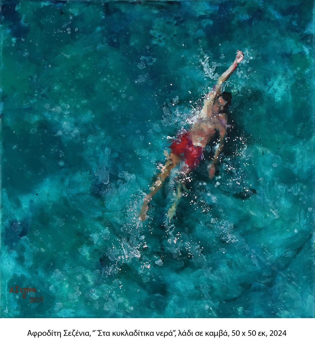 «Στο έργο της Αφροδίτης Σεζένια υπάρχει μπλε χρώμα που χαϊδεύει τον καμβά της και τον πλημμυρίζει θάλασσα, σχολιάζει η ιστορικός τέχνης Ίρις Κρητικού. Υπάρχει παντού φώς, διάχυτο και αληθινό. Είναι έργο βαθιά συγκινητικό, ανθρώπινο, τυλιγμένο σε αυτό το διακεκομμένο τοπίο. Η ζωγράφος επιλέγει μια διαφορετική αλλά ιδανική κάθε φορά στιγμή. Ακριβώς τη στιγμή εκείνη που θα έπρεπε ένα χέρι να πατήσει το κλικ του φακού, ακριβώς τη στιγμή εκείνη που θα έπρεπε η μνήμη να πατήσει το κλικ των όσων σχεδόν αθέατα τρυφερών στιγμών θα ήθελε να θυμάται».