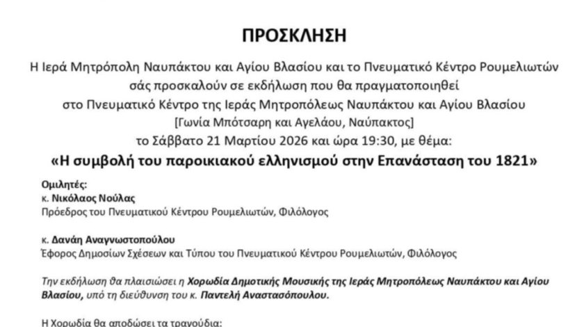 Η εκδήλωση θα πραγματοποιηθεί το Σάββατο 21 Μαρτίου 2026 και ώρα 19:30, στο Πνευματικό Κέντρο της Ιεράς Μητροπόλεως Ναυπάκτου και Αγίου Βλασίου, στη Ναύπακτο.
