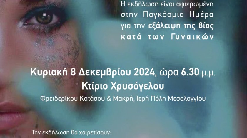 Ο Δήμος Ιερής Πόλης Μεσολογγίου και η Δημοτική Επιτροπή Ισότητας των Φύλων, σας προσκαλούν στην εκδήλωση «Μια Ιστορία από τα Παλιά: Η Βία κατά των Γυναικών», η οποία είναι αφιερωμένη στην Παγκόσμια Ημέρα για την εξάλειψη της Βίας κατά των Γυναικών, την Κυριακή, 8 Δεκεμβρίου 2024 στις 18:30 στο Κτίριο Χρυσόγελου (Φρειδερίκου Κατάσου & Μακρή, Ιερή Πόλη Μεσολογγίου).