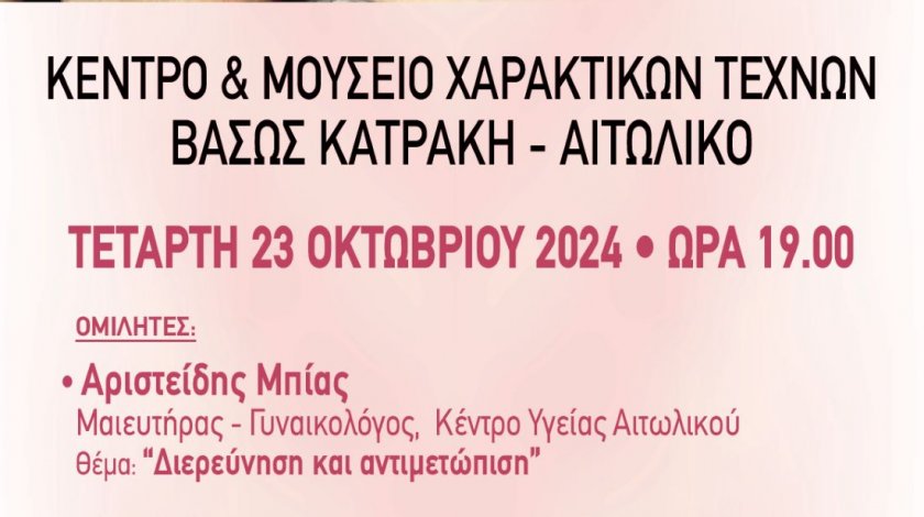 Το Κέντρο Υγείας Αιτωλικού σας προσκαλεί στην ενημερωτική εκδήλωση που διοργανώνει στο Κέντρο & Μουσείο Χαρακτικών Τεχνών «Βάσω Κατράκη» υπό την αιγίδα του Δήμου Ιεράς Πόλεως Μεσολογγίου την Τετάρτη, 23 Οκτωβρίου 2024 και ώρα 19:00 με θέμα: