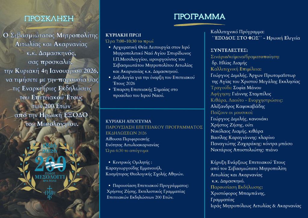 Με λαμπρότητα και υψηλό συμβολισμό εγκαινιάζεται από τον Σεβασμιώτατο Μητροπολίτη Αιτωλίας και Ακαρνανίας κ. Δαμασκηνό την Κυριακή 4 Ιανουαρίου 2026, το Επετειακό Έτος της Τοπικής μας Εκκλησίας, για τη συμπλήρωση 200 ετών από την Ηρωική Έξοδο της Φρουράς του Μεσολογγίου.