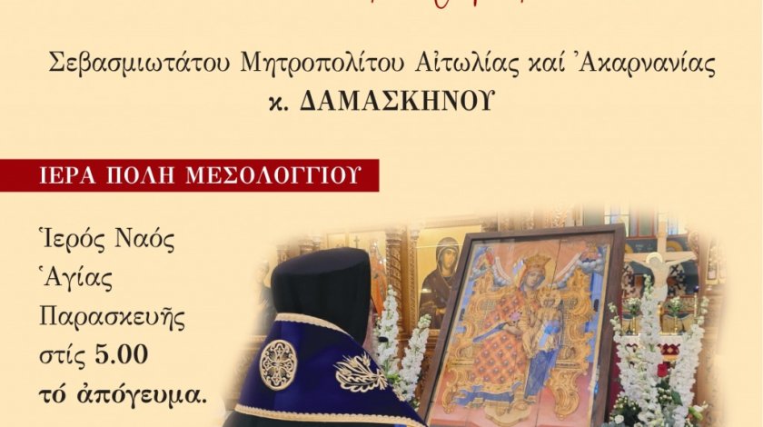 Το πρώτο Εσπερινό Κήρυγμα στην Ιερά Πόλη του Μεσολογγίου θα πραγματοποιηθεί την ερχόμενη Κυριακή 20 Οκτωβρίου 2024 και ώρα 17.00’ το απόγευμα στον
