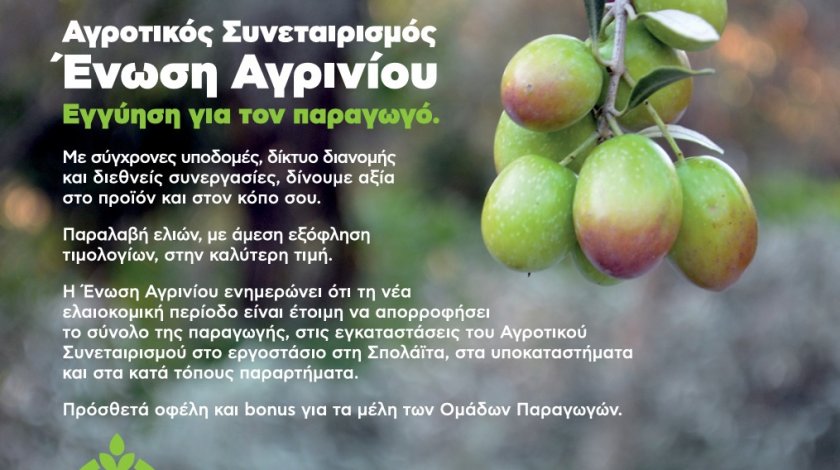 Η Ένωση Αγρινίου, με τις ισχυρές Ομάδες Παραγωγών και τις υποδομές της, όπως κάθε χρόνο δηλώνει έτοιμη για τη νέα ελαιοκομική περίοδο, τόσο σε ότι αφορά την απορρόφηση – παραλαβή της της επιτραπέζιας ελιάς όσο και σε ότι έχει να κάνει με την παράλληλη υποστήριξη στους ελαιοκαλλιεργητές, φυσικά παρέχοντάς τους και τα εφόδια που έχουν ανάγκη.