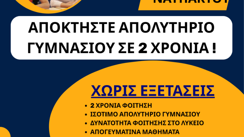 Όσες και όσοι ενδιαφέρονται να εγγραφούν στο Σχολείο Δεύτερης Ευκαιρίας Ναυπάκτου μπορούν να προσέρχονται στο σχολείο μέχρι τις 15 Σεπτεμβρίου 2025, τις εργάσιμες ημέρες και απογευματινές ώρες, από τις 5μ.μ. έως και τις 8.00μ.μ.