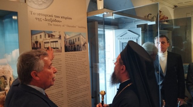 Ο κ. Κορδόσης υποδέχθηκε θερμά τον Μητροπολίτη κ. Δαμασκηνό, παρουσία φίλων του Κέντρου και τον ξενάγησε στους χώρους της «Διεξόδου», όπου εκτίθενται κειμήλια της Επανάστασης του ’21, αρχαία ευρήματα από την περιοχή,