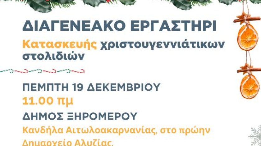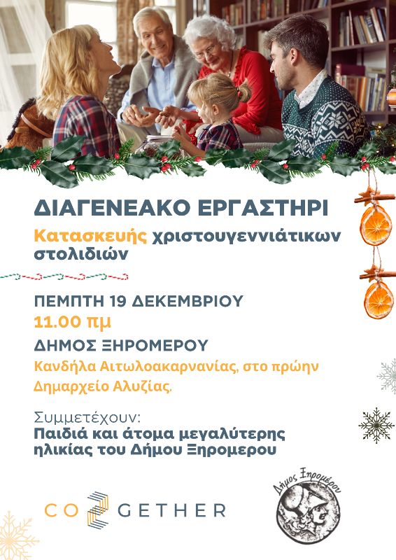 Σας ενημερώνουμε ότι την Πέμπτη 19 Δεκεμβρίου και ώρα 11 π.μ. στο πρώην Δημαρχείο Κανδήλας, θα πραγματοποιηθεί εργαστήρι χριστουγεννιάτικων στολιδιών με την συνεργασία της Co2gether, στην οποία θα συμμετάσχουν παιδιά του Δημοτικού Σχολείου Κανδήλας, οι παππούδες, οι γιαγιάδες, αλλά και άτομα μεγαλύτερης ηλικίας που έχουν διάθεση για δημιουργίες.