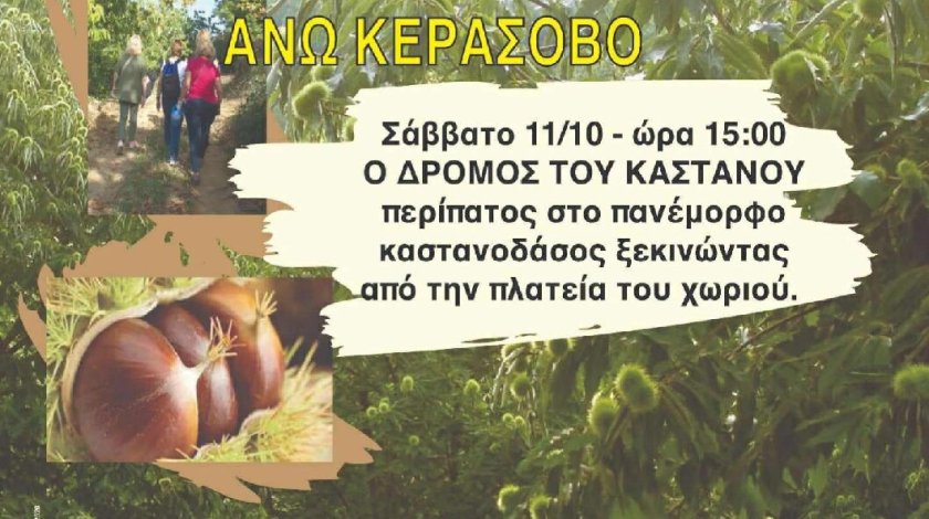 Ο Δήμος Αγρινίου και ο Πολιτιστικός Περιβαλλοντικός Σύλλογος Άνω Κερασόβου διοργανώνουν τη φετινή «Γιορτή Κάστανου» την Κυριακή 12 Οκτωβρίου 2025, στο Άνω Κεράσοβο, στο γραφικό γήπεδο του χωριού, μέσα στο καταπράσινο δάσος.