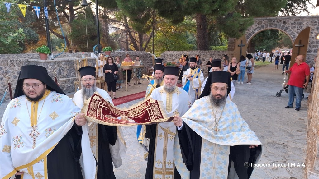 Ο Σεβασμιώτατος, αμέσως μετά την πανηγυρική υποδοχή στον προαύλιο χώρο της Μονής από τον Καθηγούμενο, Αρχιμ. Αμβρόσιο Καλλιάφα και τους Ιερείς, μετέφερε λιτανευτικά τον Επιτάφιο της Παναγίας από το Καθολικό της Μονής και τον εναπέθεσε στο ευτρεπισμένο Κουβούκλιο στον προαύλιο χώρο.